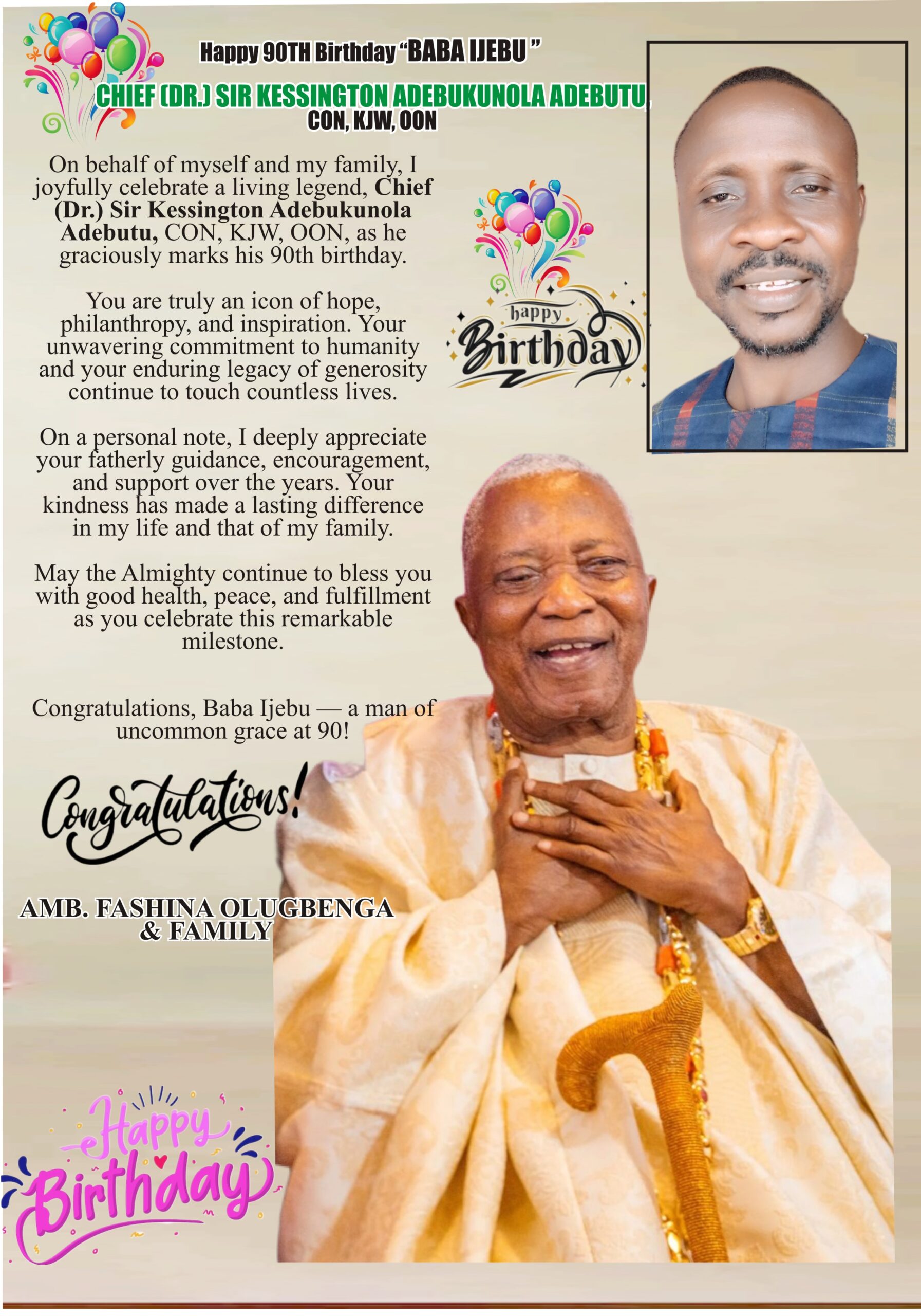 On behalf of myself and my family, I joyfully celebrate a living legend, Chief Kessington Adebutu, CON, as he graciously marks his 90th birthday.